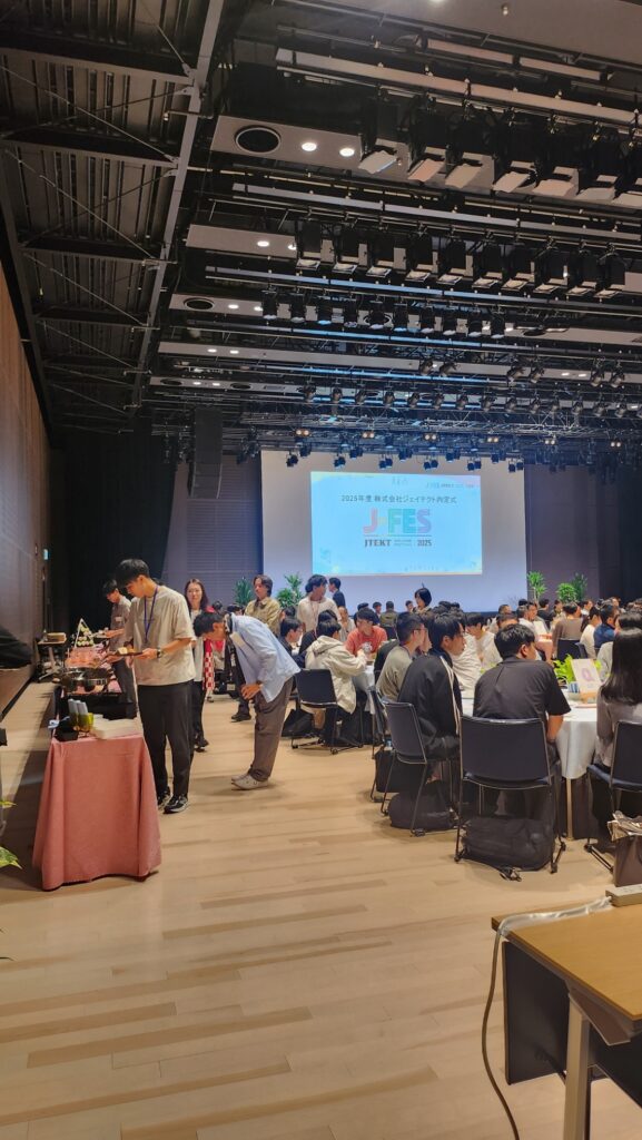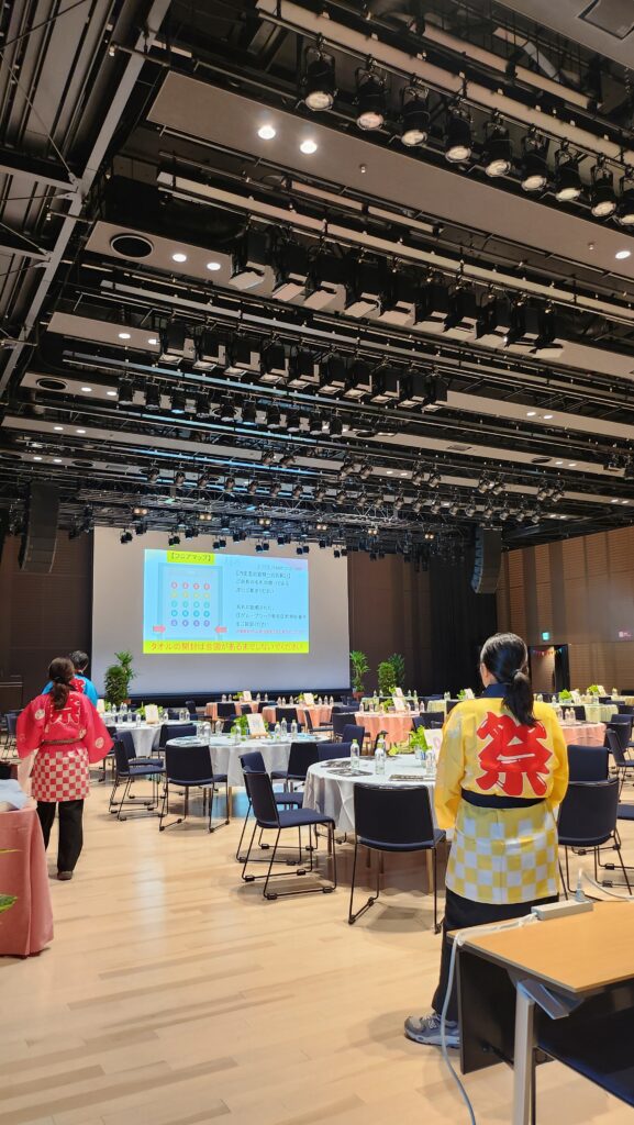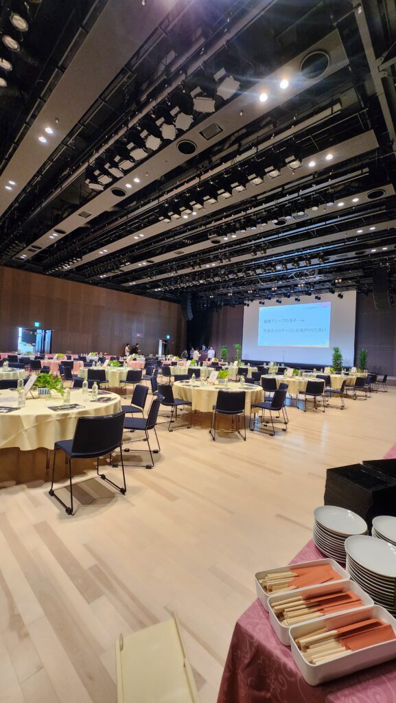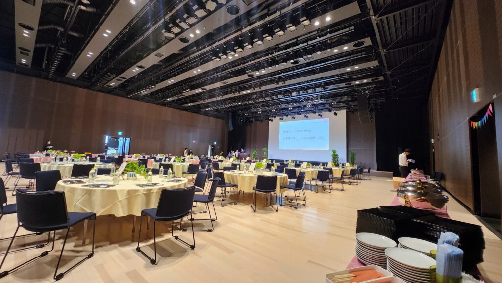 中日ホール 内定式からの懇親会 着席ブッフェスタイルでおもてなし 200名様をお迎えします。