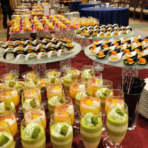- お客様:大手企業様 宴席名:『お取引先様 ご招待パーティー』 人数:約40名様 会場:イベントホール 内容:社員の方とお取引先様との交流パーティー。 各種フィンガーフードとスイーツのご提供。 ワインと各種アルコール・ソフ……